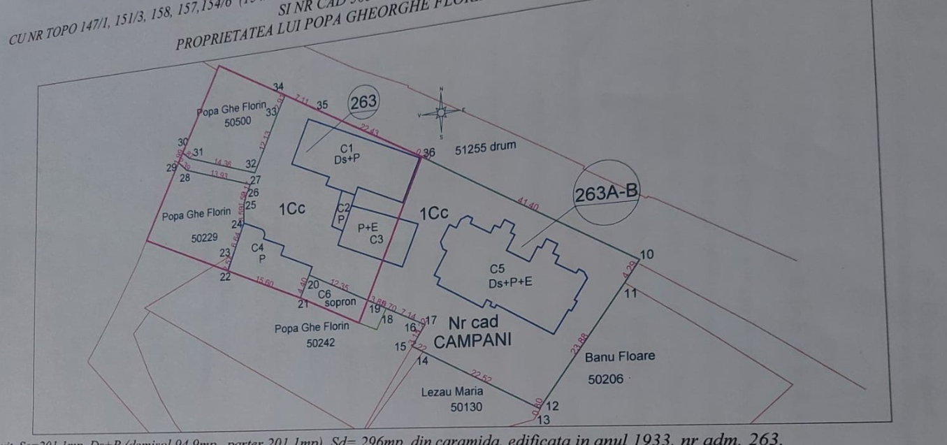 Wir verkaufen ein großes Haus mit Innenhof und Nebengebäude in der Gemeinde Cimpani, Departement Bihor in Rumänien. Das Gebäude befindet sich im zentralen Bereich der Ortschaft Cimpani. Das Haus ist ca. 200 qm groß und die Gesamtfläche beträgt 296 qm. Zum Verkauf steht laut Bebauungsplan die durch eine rote Linie abgegrenzte Fläche. Das Anwesen verfügt über 4 Schlafzimmer, 2 Wohnzimmer, 2 Badezimmer, Flure, 2 Keller und weitere Nebenräume. Die Fläche ist groß und kann touristisch erschlossen werden. 7 km von der Stadt Stei entfernt, einem Kurort von lokalem Interesse mit Thermalwasser, und 18 km vom Feriendorf Virtop auf 1100 m über dem Meeresspiegel mit 2 Skipisten. 100 km von der Grenze zu Ungarn und dem Grenzübergang der Stadt Bors in der Nähe von Oradea entfernt. Die lokalen Steuern und Abgaben werden um 50 % reduziert, da sich das Anwesen in einer hügeligen Gegend befindet. Das Haus wird mit Holzöfen beheizt; Holz ist vor Ort leicht zu kaufen. Im Haus sind Innenanstricharbeiten erforderlich. Im Gebäude C4 des Plans befindet sich eine Bäckerei, ausgestattet mit 2 traditionellen Öfen.